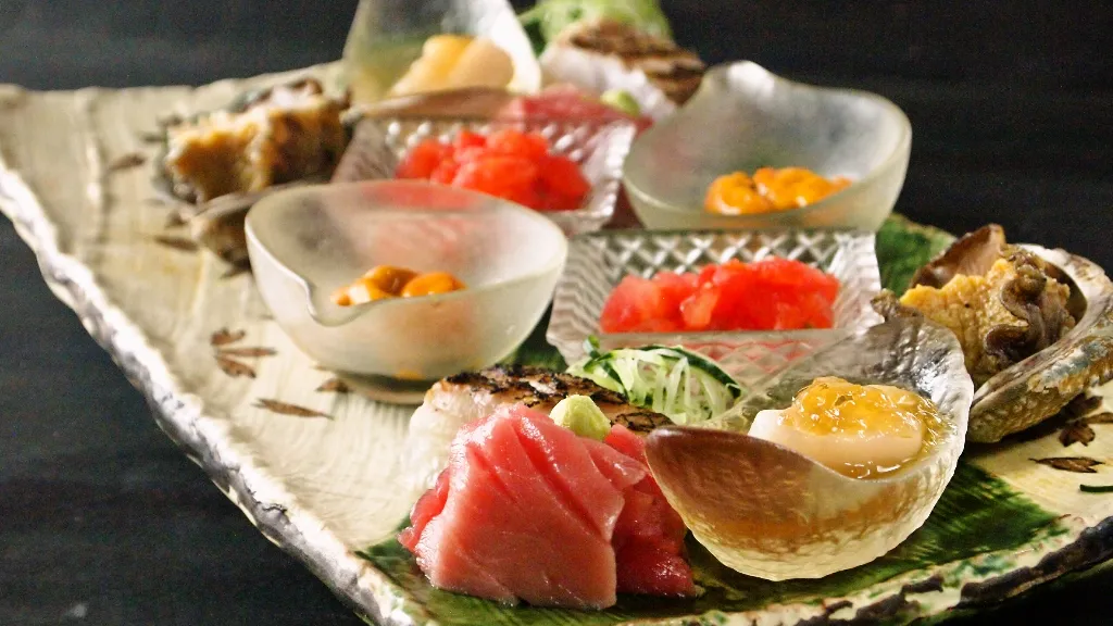 このような鮑や雲丹や毛ガニを盛り込んだ